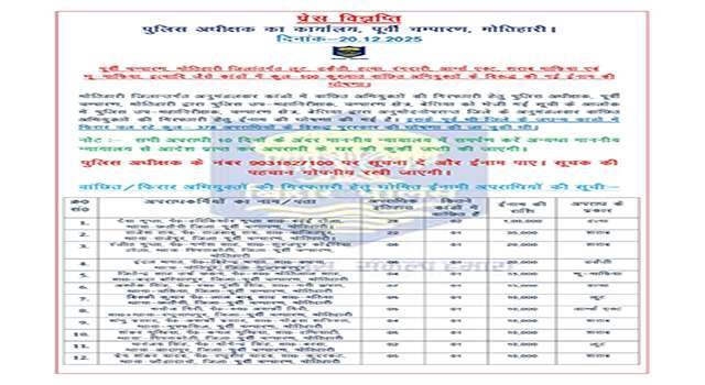 पूर्वी चम्पारण जिले में अपराध नियंत्रण को लेकर पुलिस ने बड़ी कार्रवाई की है। लूट, डकैती, हत्या, रंगदारी, आर्म्स एक्ट, शराब माफिया, भू-माफिया सहित अन्य गंभीर कांडों में वांछित कुल 100 कुख्यात अपराधियों के विरुद्ध 8 लाख 10 हजार रुपये के ईनाम की घोषणा की गई है।
